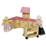 Dřevěná vila s nábytkem a figurkami. Luxusní set 87 dílů, s krásně zařízenou kuchyní, jídelnou, ložnicí a dětským pokojíkem, vč. terasy a balkonu. Rozměry: 50x75x55 cm.